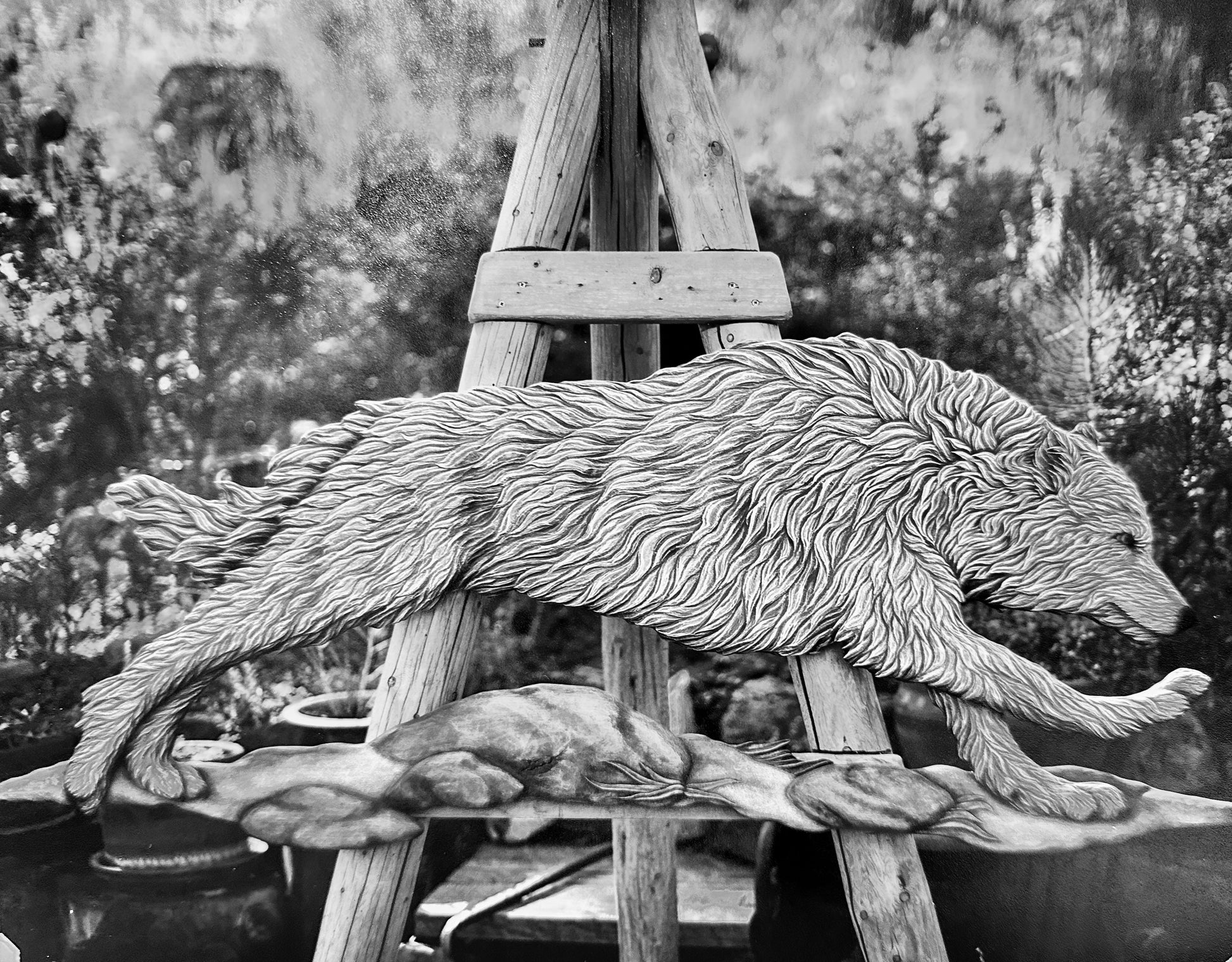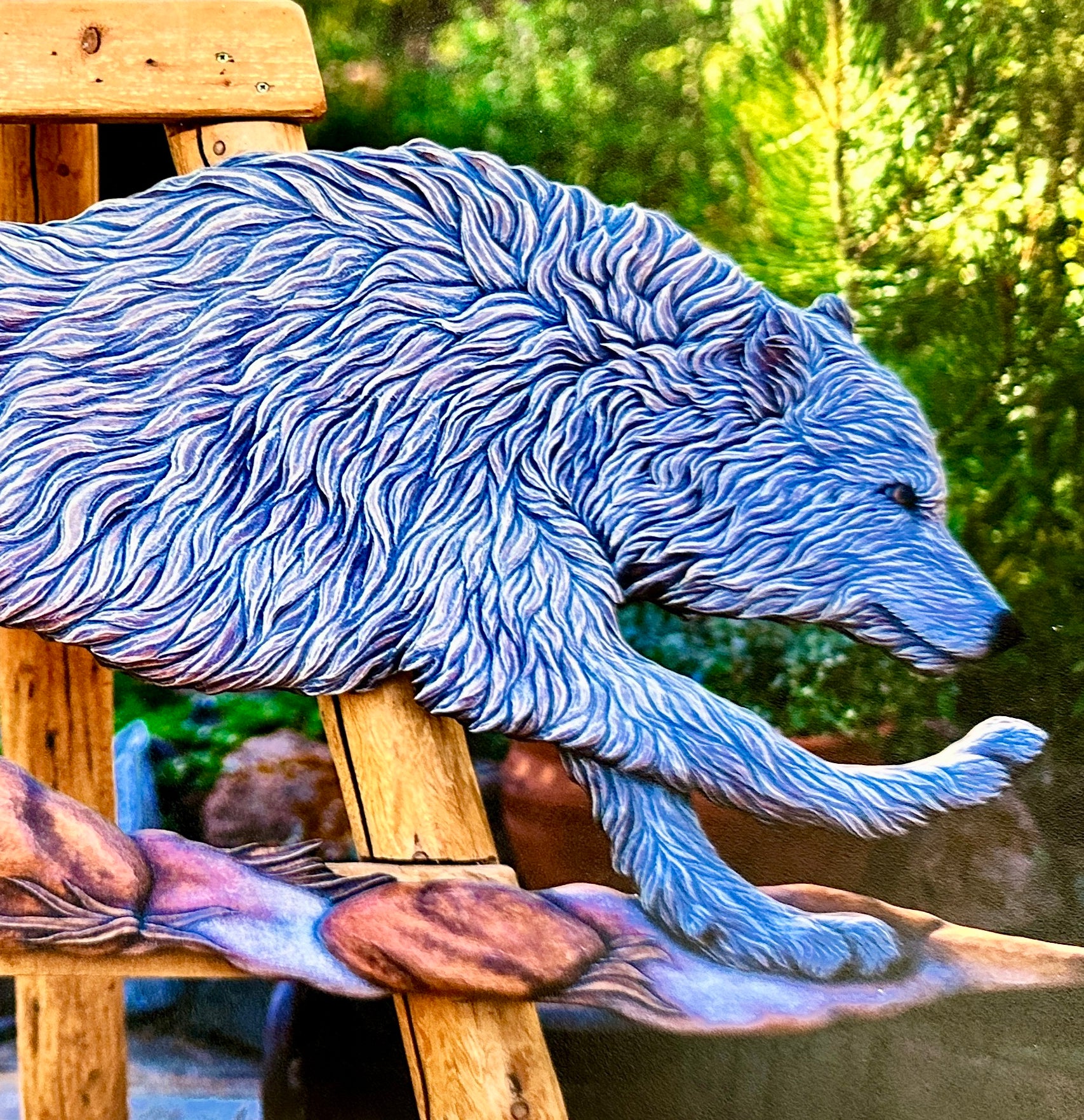 This is the first in a series of three life sized running wolves. This original wood carving measures 5 ' 5" wide, 3' 6" tall and is 2 " thick.